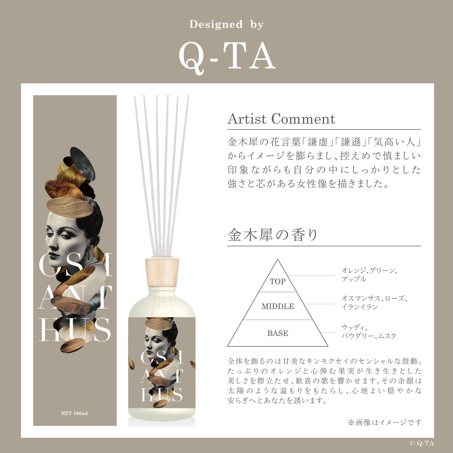 金木犀の花言葉「謙虚」「謙遜」「気高い人」からイメージを膨らまし、控えめで慎ましい印象ながらも自分の中にしっかりとした強さと芯がある女性像を描きました。